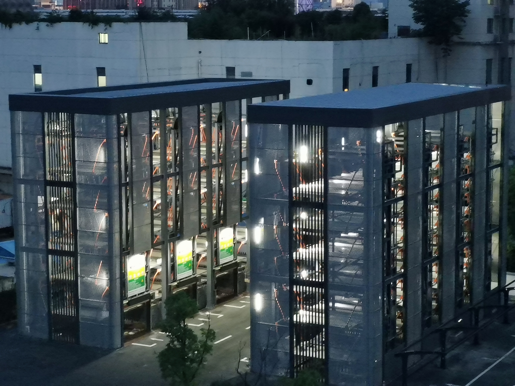 白天,藍天綠樹掩映下,兩座車庫古樸大氣,和整個移動園區環境和諧一體。晚上,車庫有亮化效果,燈光打開后成為夜晚中“最亮的崽”。
